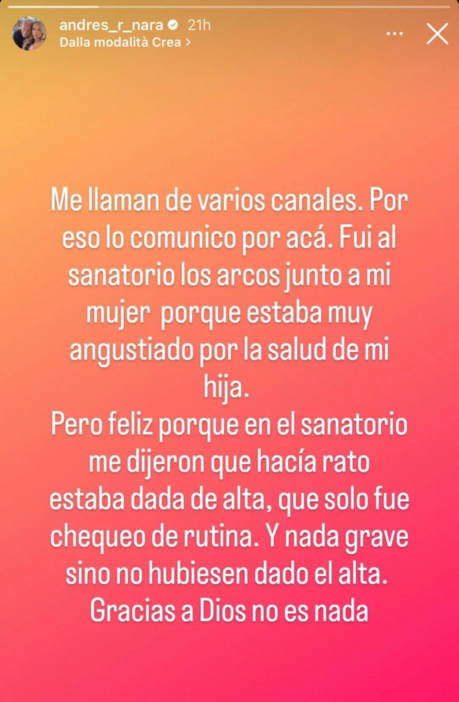 Andrés Nara, padre di Wanda, ieri ha postato su Instagram un messaggio rassicurante: “Sono andato a Los Arcos con mia moglie perché ero molto preoccupato per la salute di mia figlia. Ma sono felice perché mi hanno detto che era stata dimessa da tempo. Era solo un controllo di routine. E niente di grave, altrimenti non sarebbe stata dimessa”.